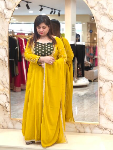 Elegant 3pcs Mustard Colour Anarkali Suits Russian Silk