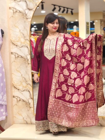 Maroon silk-blend Anarkali Kurta Set with Maroon – Golden neck design paired with Banarasi Silk Dupatta, Bottom narrow pant