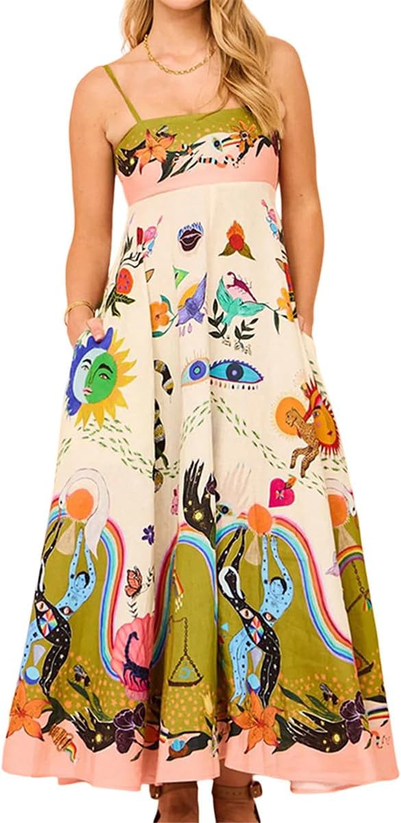 Make a bold style statement with this uniquely designed maxi dress featuring an artistic blend of abstract motifs and vibrant colors. From playful sun and rainbow elements to intricate nature-inspired prints, this dress is a wearable piece of art.