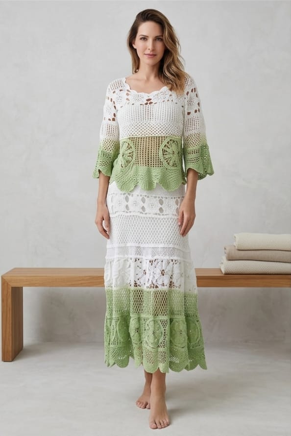 The breathable crochet fabric offers a perfect balance of style and comfort, while the coordinated top and skirt create a seamless, polished look. With its flowy silhouette and fine detailing, this set is ideal for both relaxed daytime outings and graceful evening gatherings.