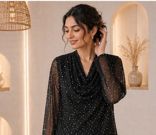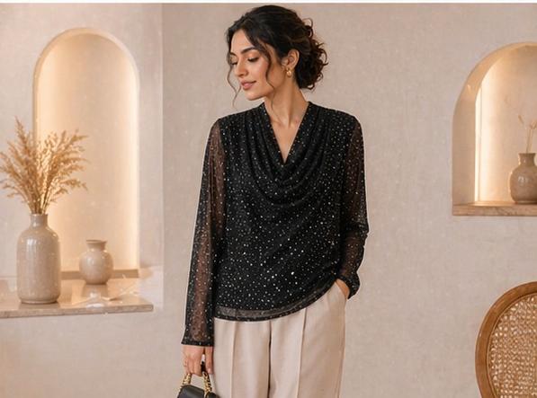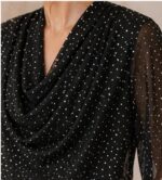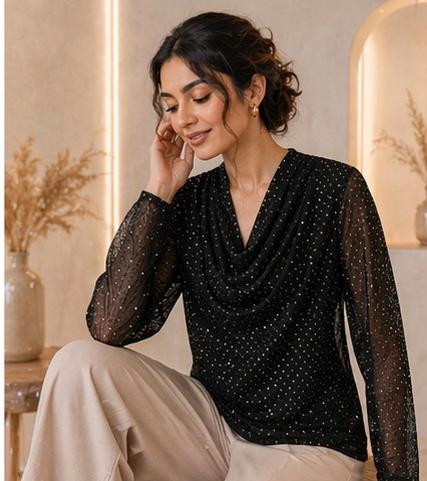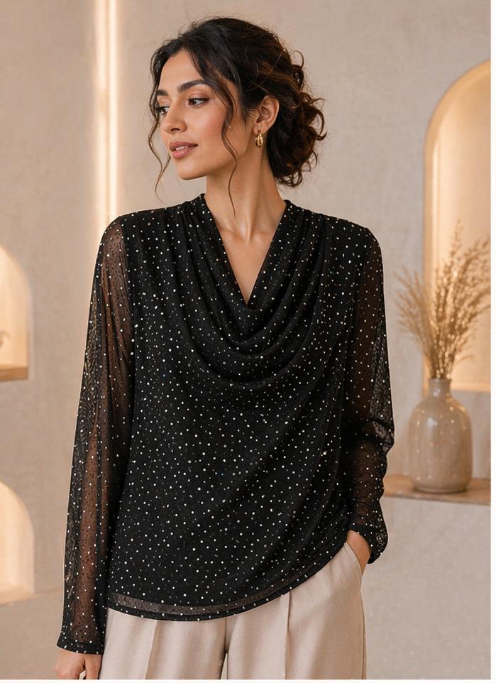 Turn heads with this effortlessly chic black top, designed with a graceful drape neckline and delicate shimmer detailing. Crafted from lightweight sheer fabric, it features subtle dotted embellishments that add a refined sparkle without overwhelming the look. The flowy silhouette and soft texture make it both comfortable and sophisticated—perfect for evening outings or special occasions.
