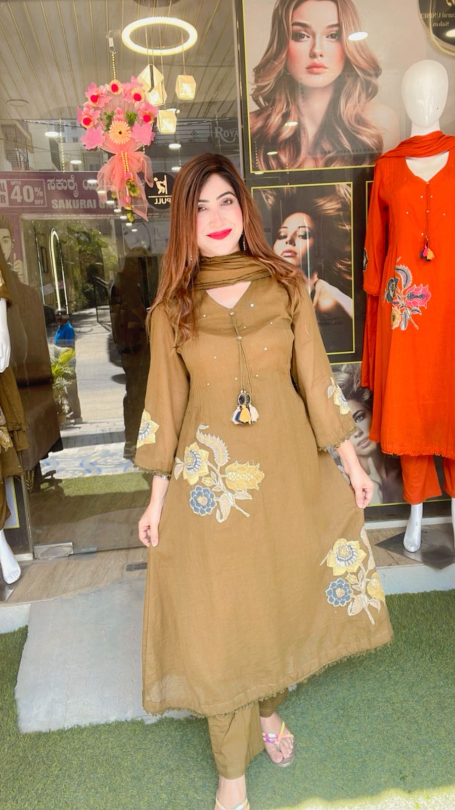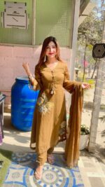 Elegant and refreshing — this 3 Piece Suit in a soothing olive green shade is crafted from soft mul cotton, offering both style and comfort for everyday wear and festive occasions.