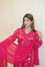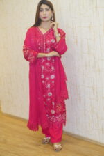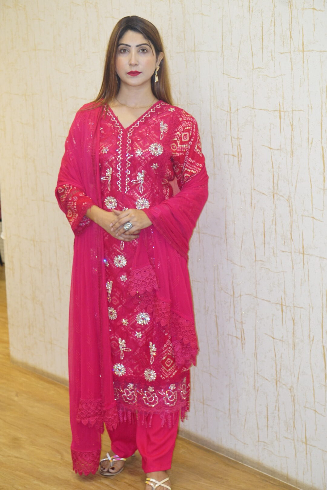 A vibrant festive outfit — this Hot Pink Straight Suit combines the beauty of traditional Leheriya & Bandhej prints with delicate stone embellishments, paired with a soft georgette dupatta. Perfect for festive wear, weddings, and special occasions.