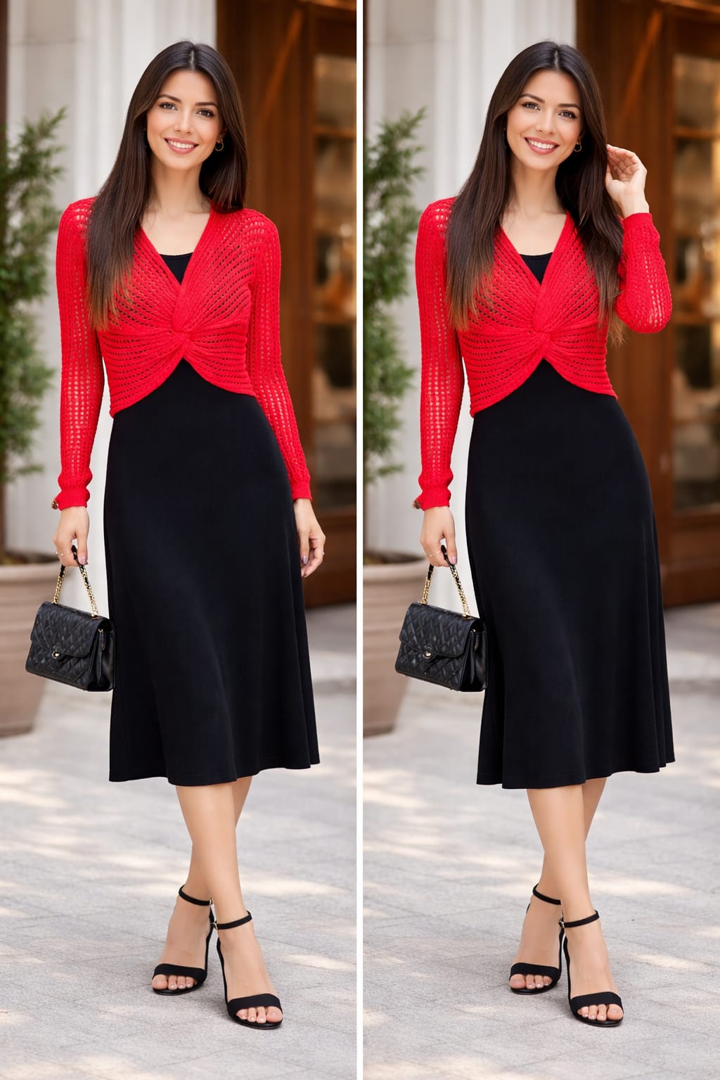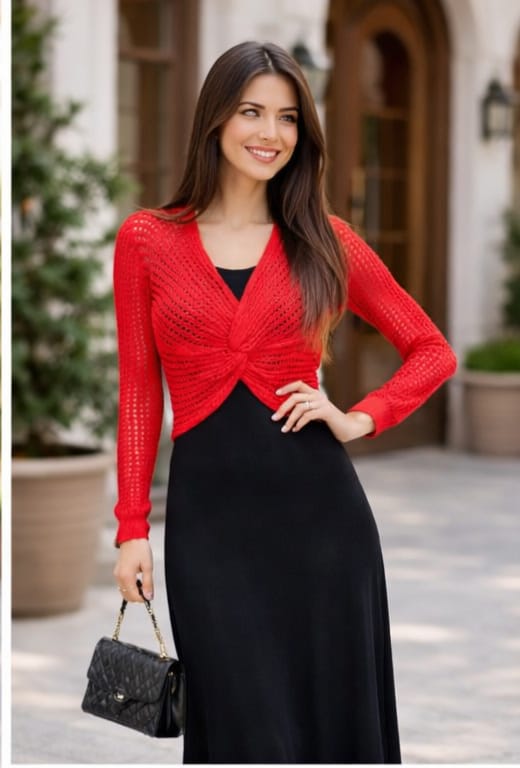 Turn heads with this striking fusion of bold and elegant. This stunning ensemble features a sleek midnight black midi dress paired with a vibrant scarlet red crochet twist-front overlay, creating a perfect balance of sophistication and statement style.
