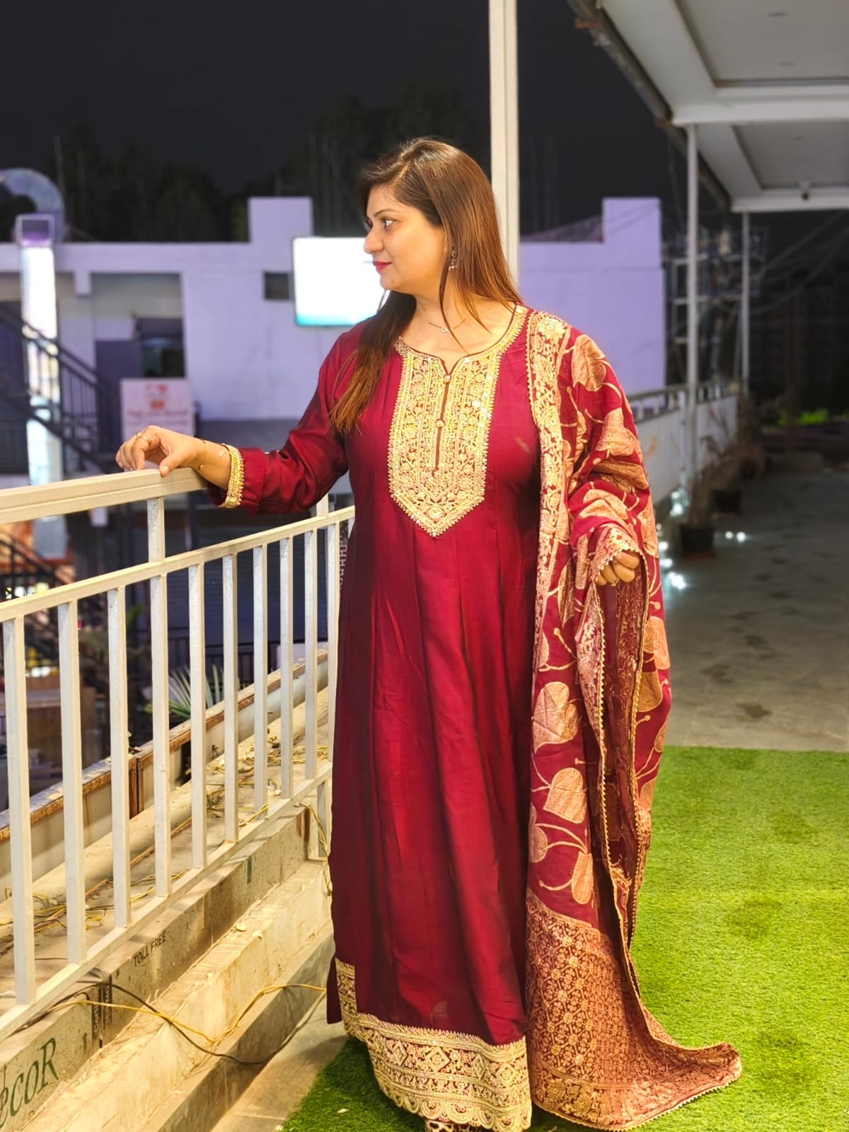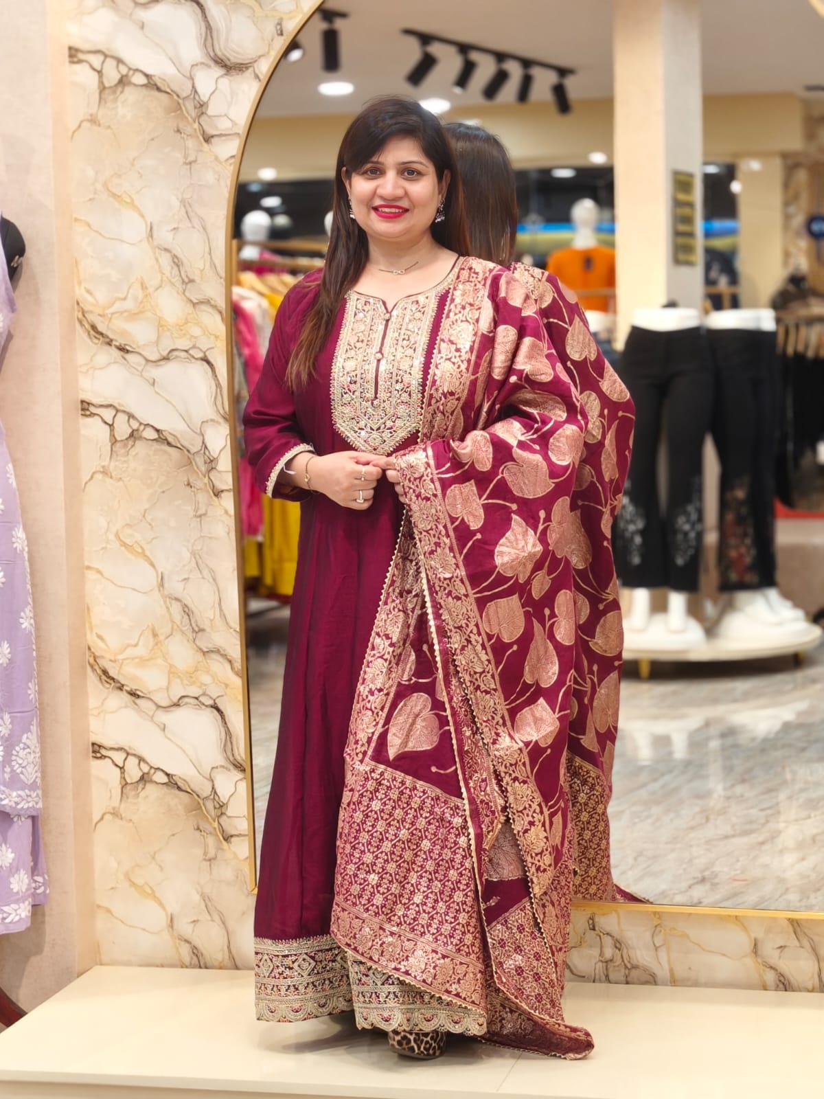 Maroon silk-blend Anarkali Kurta Set with Maroon – Golden neck design paired with Banarasi Silk Dupatta, Bottom narrow pant