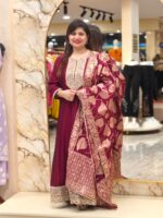 Be the first to review “Maroon silk-blend Anarkali Kurta Set with Maroon – Golden neck design paired with Banarasi Silk Dupatta, Bottom narrow pant” Cancel reply