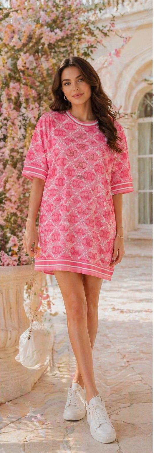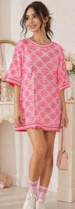 Playful, comfy, and effortlessly stylish—this pink printed one-piece dress is your go-to for easy, everyday fashion. Designed in a relaxed, oversized silhouette, it features a vibrant all-over geometric monogram print that adds a fun, trendy vibe to your look.