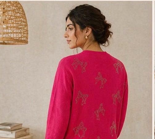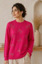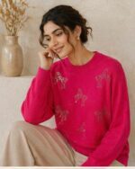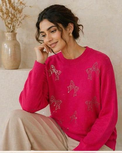 Add a pop of elegance to your everyday wardrobe with this vibrant pink knit sweater. Designed with a relaxed silhouette, it features delicate butterfly-inspired embellishments that bring a subtle sparkle and feminine charm. The soft, breathable knit ensures all-day comfort, while the classic round neckline and full sleeves make it a versatile choice for both casual and semi-dressy looks.
