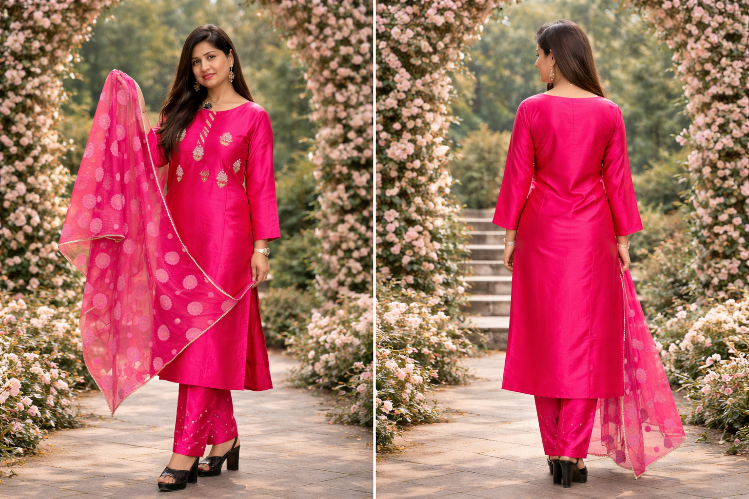 This stunning silk ensemble in vibrant pink is where elegance meets effortless charm. The delicate embroidery paired with a sheer dupatta creates a look that’s both timeless and radiant 💫