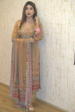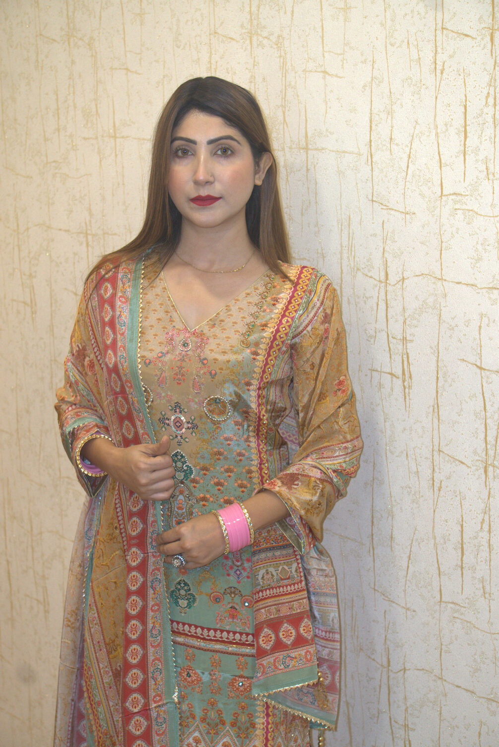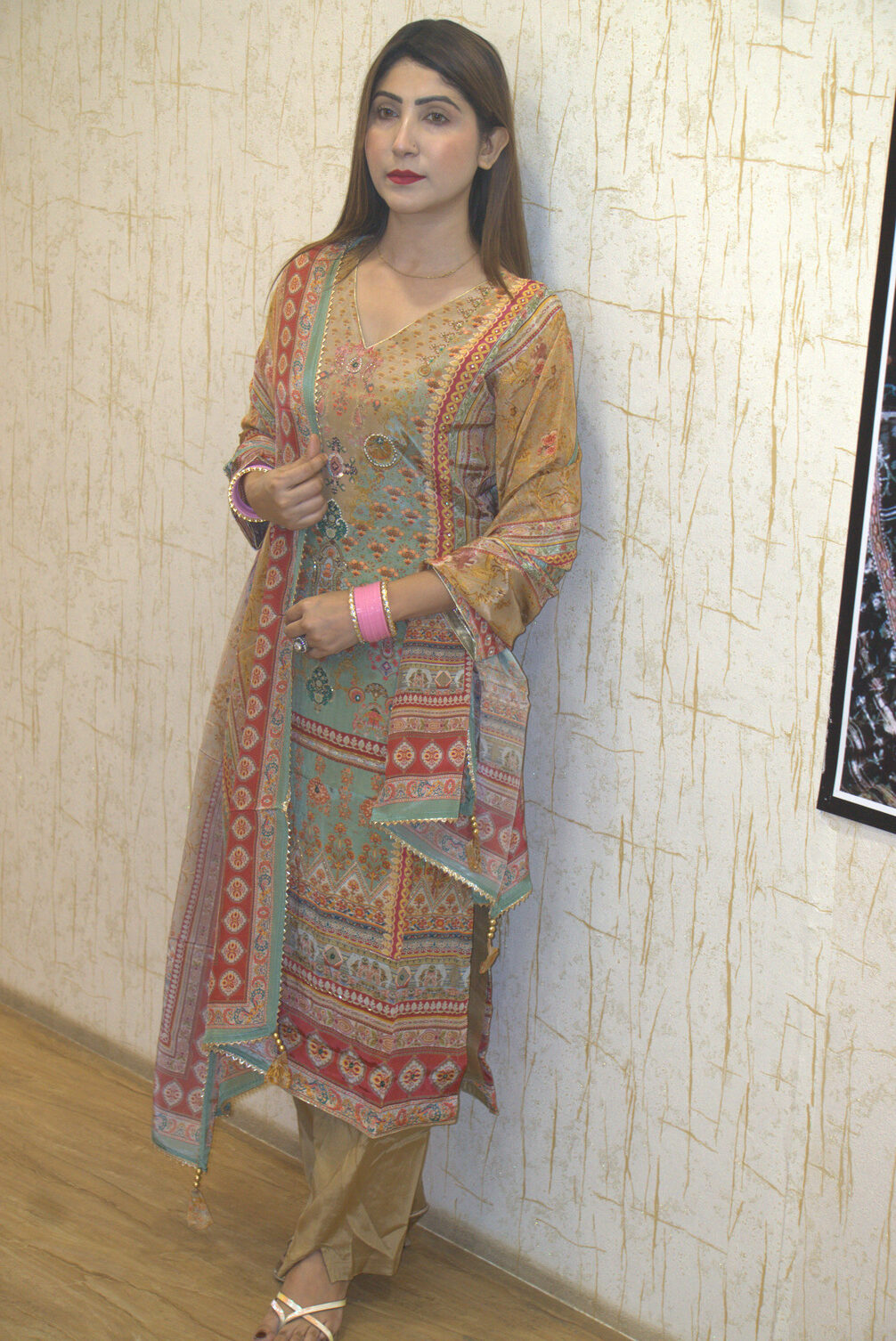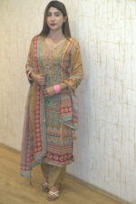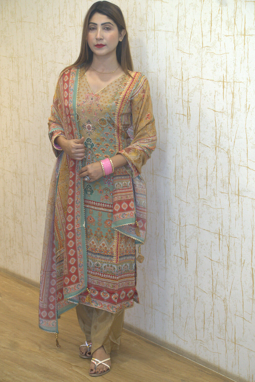This multicolored straight suit is crafted from premium heavy crepe for a rich fall and comfortable drape. Mirror pasting across the yoke and border adds just the right amount of sparkle — subtle yet eye-catching. Comes with a matching pant and a flowing dupatta to complete the set.